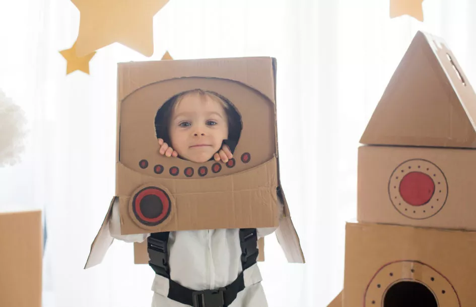 Building activities spark problem-solving and persistence. Try some cardboard box creations. Give your child a big cardboard box and some crayons or markers. Let them turn it into a rocket, a shop, or a hideout. Add a flashlight or stuffed animals to make it cozy inside. Independent construction activities like this support creativity and imaginative play.